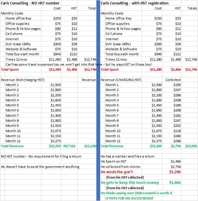 As you can see from these models, it’s hard to make a case for NOT registering to collect HST! Even if you only spend $5,000 each year on business expenses - the HST is $650 - and it’s year after year after year.